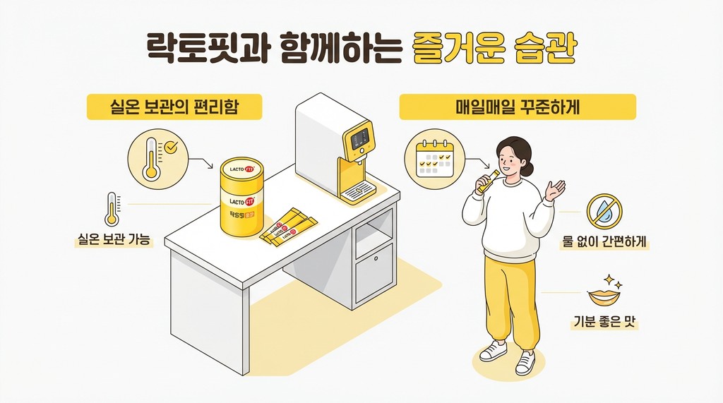 유산균 유목민 생활을 청산한 분들이 한목소리로 말하는 성공 비결은 결국 ‘꾸준함’이에요. 비싼 유산균을 사놓고도 냉장고 구석에서 유통기한을 넘겨버린 경험, 다들 한 번쯤 있으실 거예요. 눈에 잘 띄는 식탁이나 정수기 옆에 둘 수 있다는 점은 매일 섭취하는 습관을 만드는 가장 강력한 무기가 돼요.