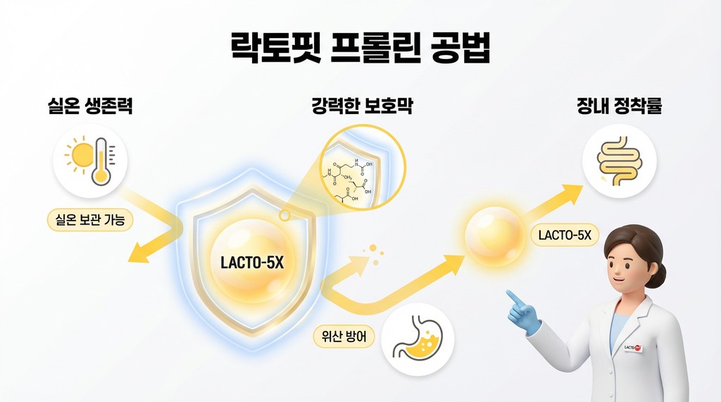 락토핏이 냉장 보관 없이도 유산균의 활성을 유지할 수 있는 핵심은 바로 ‘프롤린 공법’이에요. 유산균은 열과 산에 취약하다는 것이 일반적인 인식이에요. 하지만 이 특허 기술은 유산균을 보호막으로 감싸 위산과 담즙산은 물론, 다양한 외부 환경으로부터 균을 안전하게 지켜줘요.